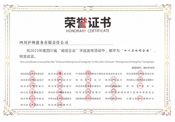 ? ? ? ?誠實守信,榜樣先行。近期,四川省發(fā)展改革委等25部門聯(lián)合發(fā)布2021年度 “誠信企業(yè)”評選結(jié)果,瀘州港務(wù)公司成功獲評2021年度“四川省誠信企業(yè)”。